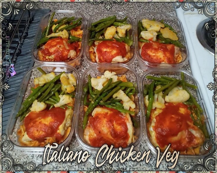- Divide pasta, veggies, and chicken across 6 food storage containers for dinners in advance. Add some sauce to top of each chicken thigh. Put them in fridge. They’ll be good for 5 days so one meal should be eaten that day of prep.